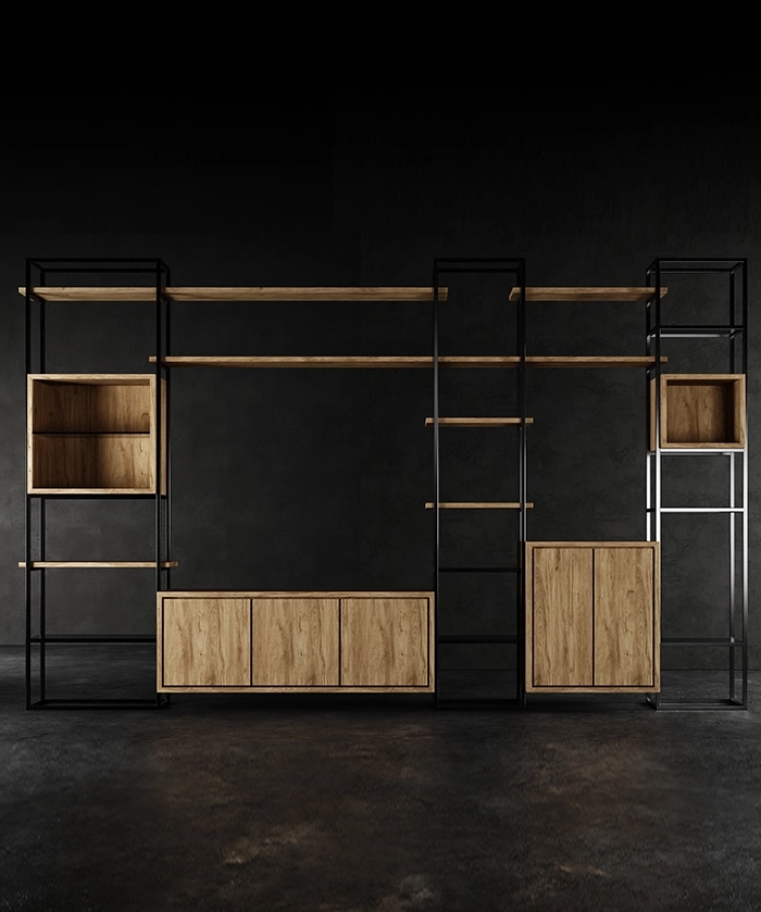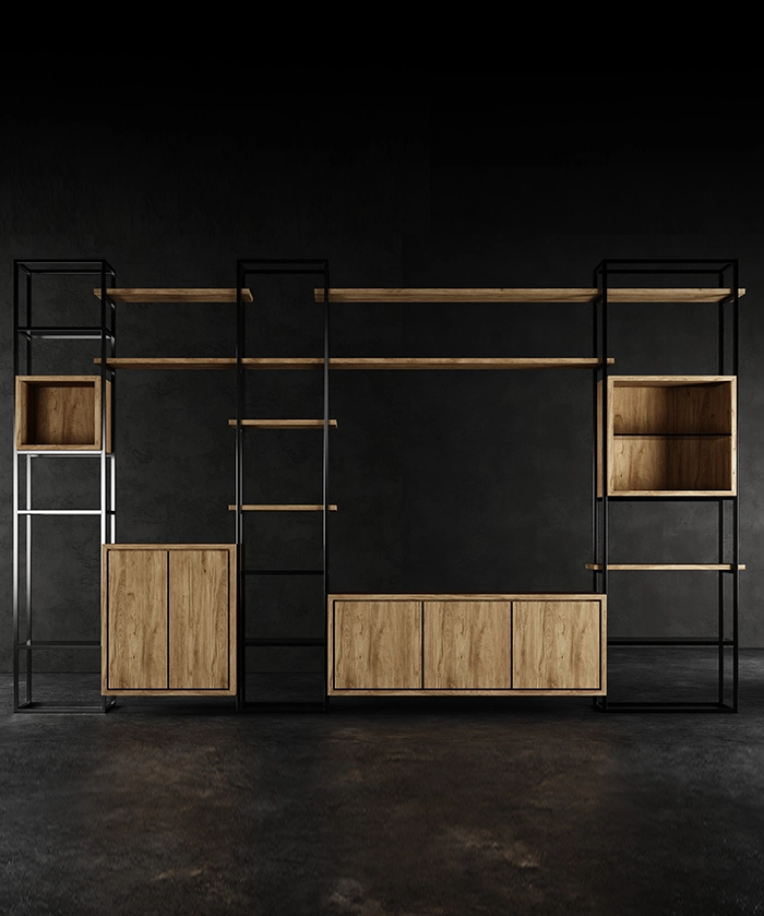 Credenze, ripiani e cubi con spazio per lo schermo.
