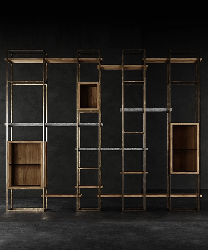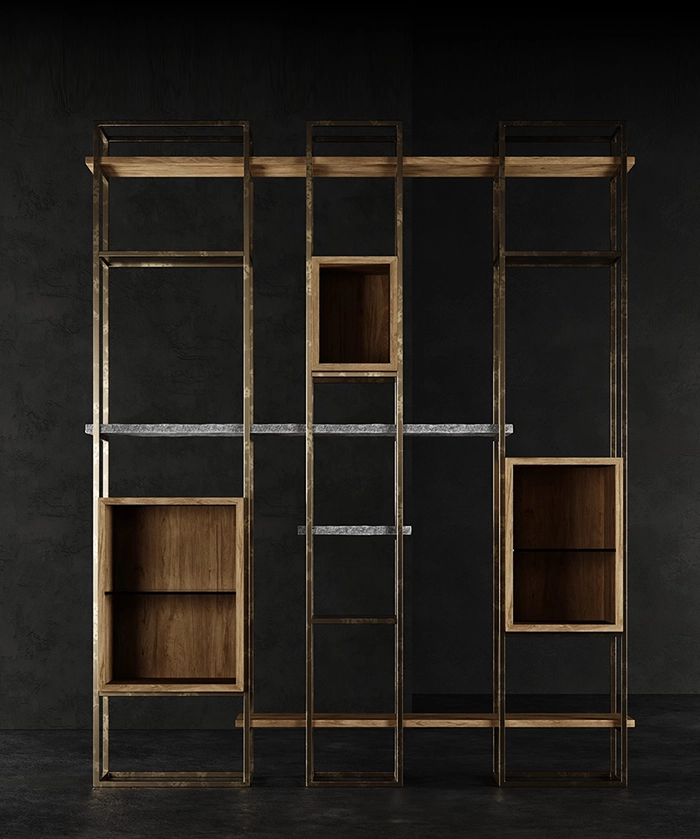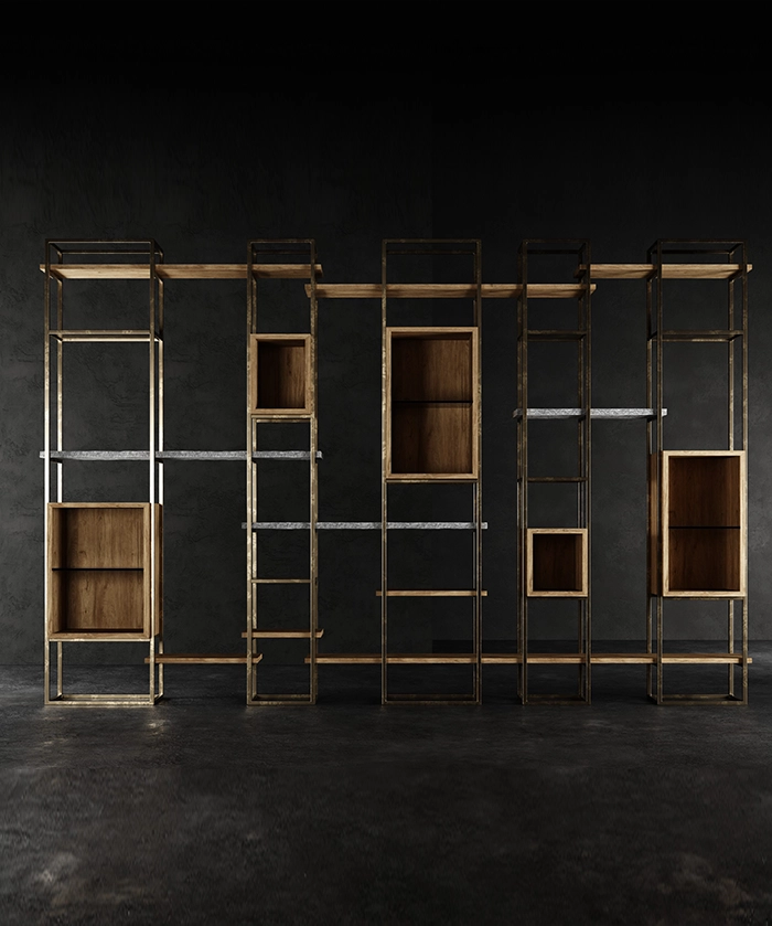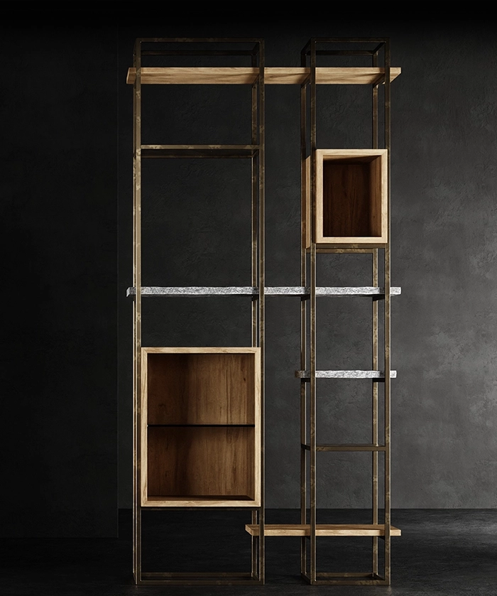Un connubio tra luci ed ombre, formato dall’intreccio di legno e ferro, in diverse profondità.